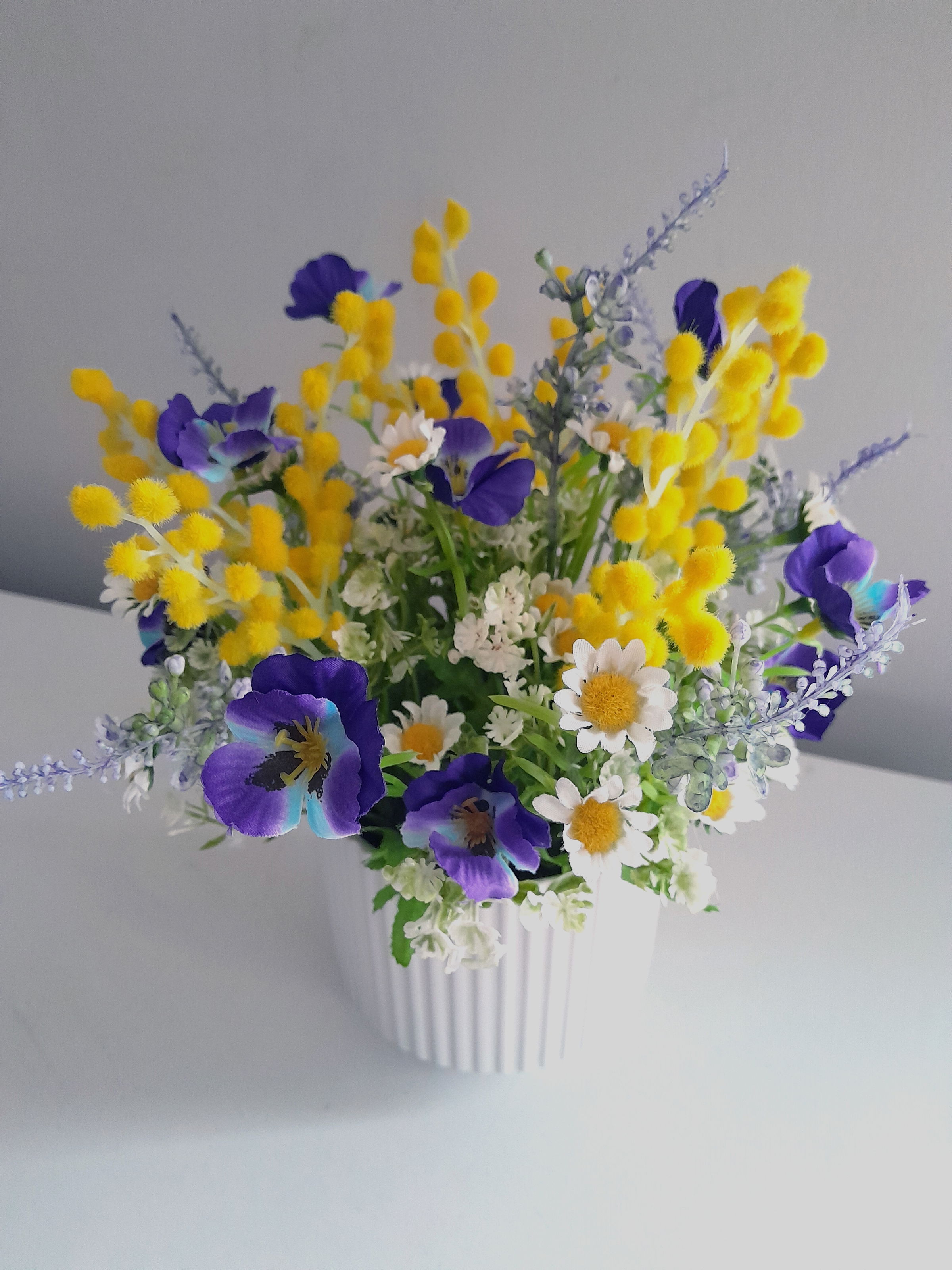 This bright floral arrangement in a white ceramic pot is filled with artificial pansy, mimosa and lavender. Also available in pink/ yellow.