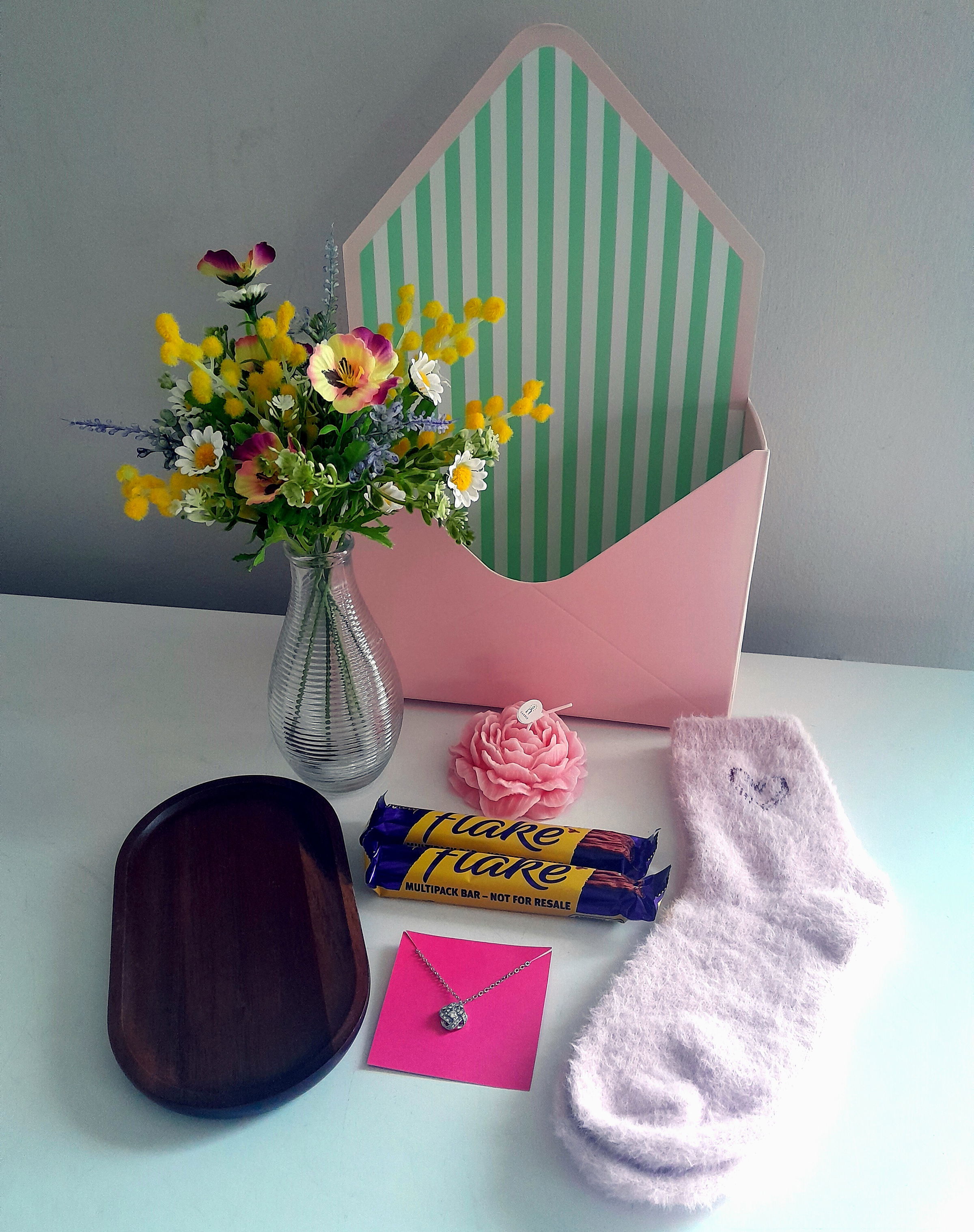 Treat your mum this year to one of our gift boxes, complete with: Acacia wood tea tray, scented flower candle, fluffy socks, chocolates, & love knot necklace.
