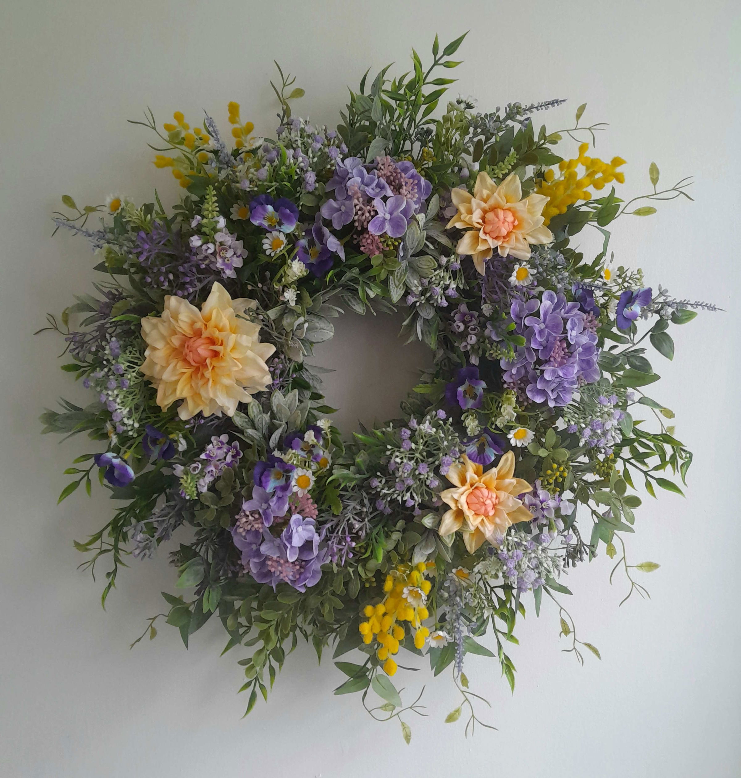 This wreath is bursting with real touch florals, including Pansy, Mimosa, Lavender, Viburnum, Physostegia, Ruscus, Wax Flower, Dahlias, & Gypsophila.