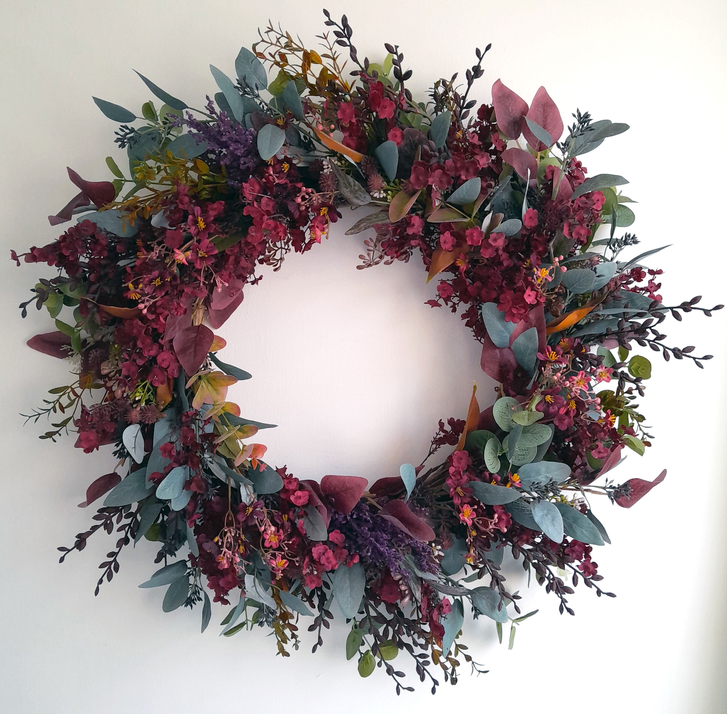 Our 'Burgundy Berry' wreath is designed with boxwood, eucalyptus, burgundy leaves, gypsophila, nicolli, and pokeberry plus a large burgundy velvet bow.