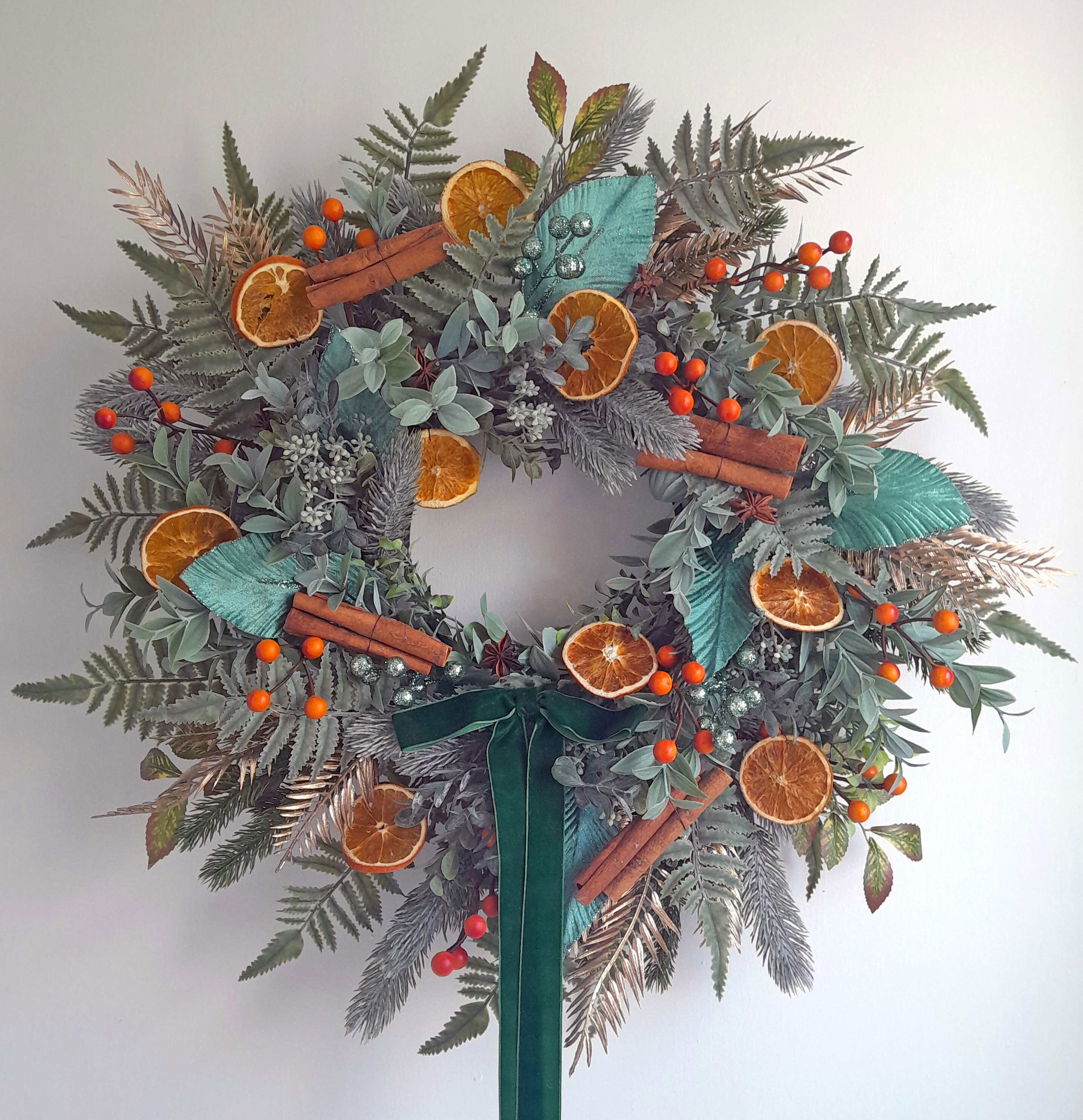 Adorned with pine, ferns, ruscus, boxwood, gold fern, orange berries, turquoise glitter berries, cinnamon sticks, star anise, orange slices and a green velvet bow.