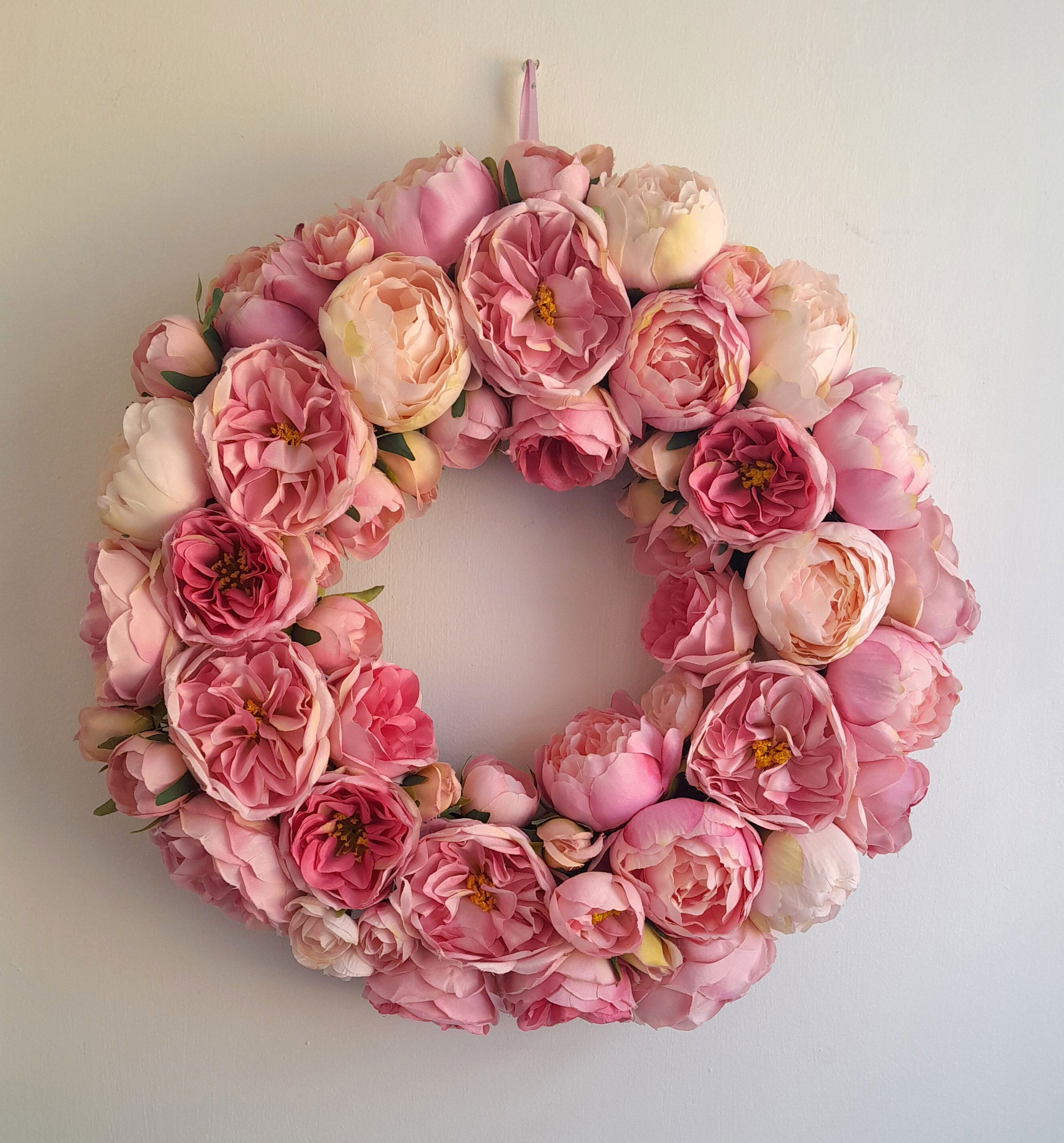 A pretty pastel pink wreath suitable for any front door, filled with pink peonies & roses, this wreath will give any front door a warm welcome.
