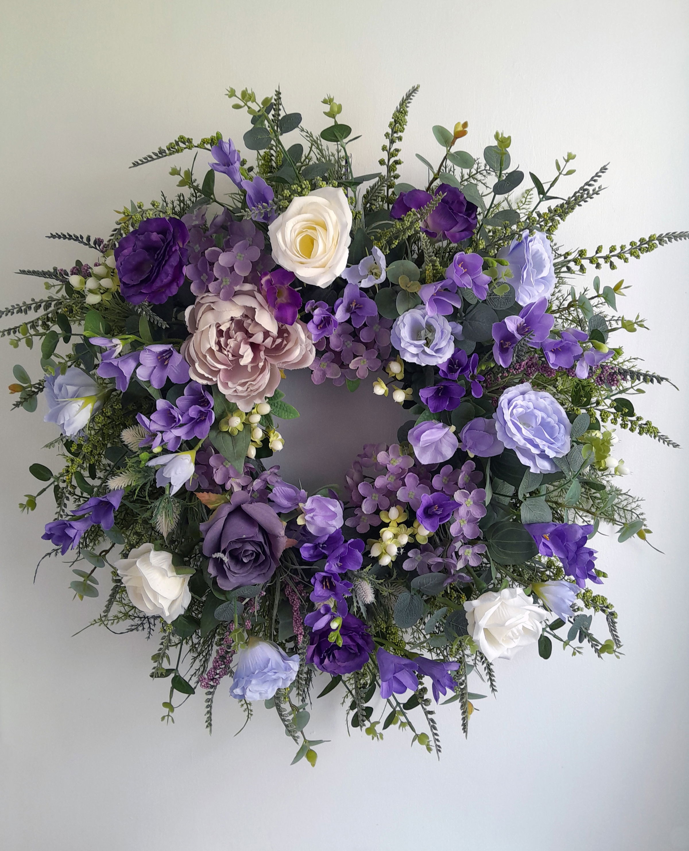 This wreath will never go out of style. Full of vibrant purple, lavender, blue, and white flowers it will brighten up any front door. (Available in other colours).