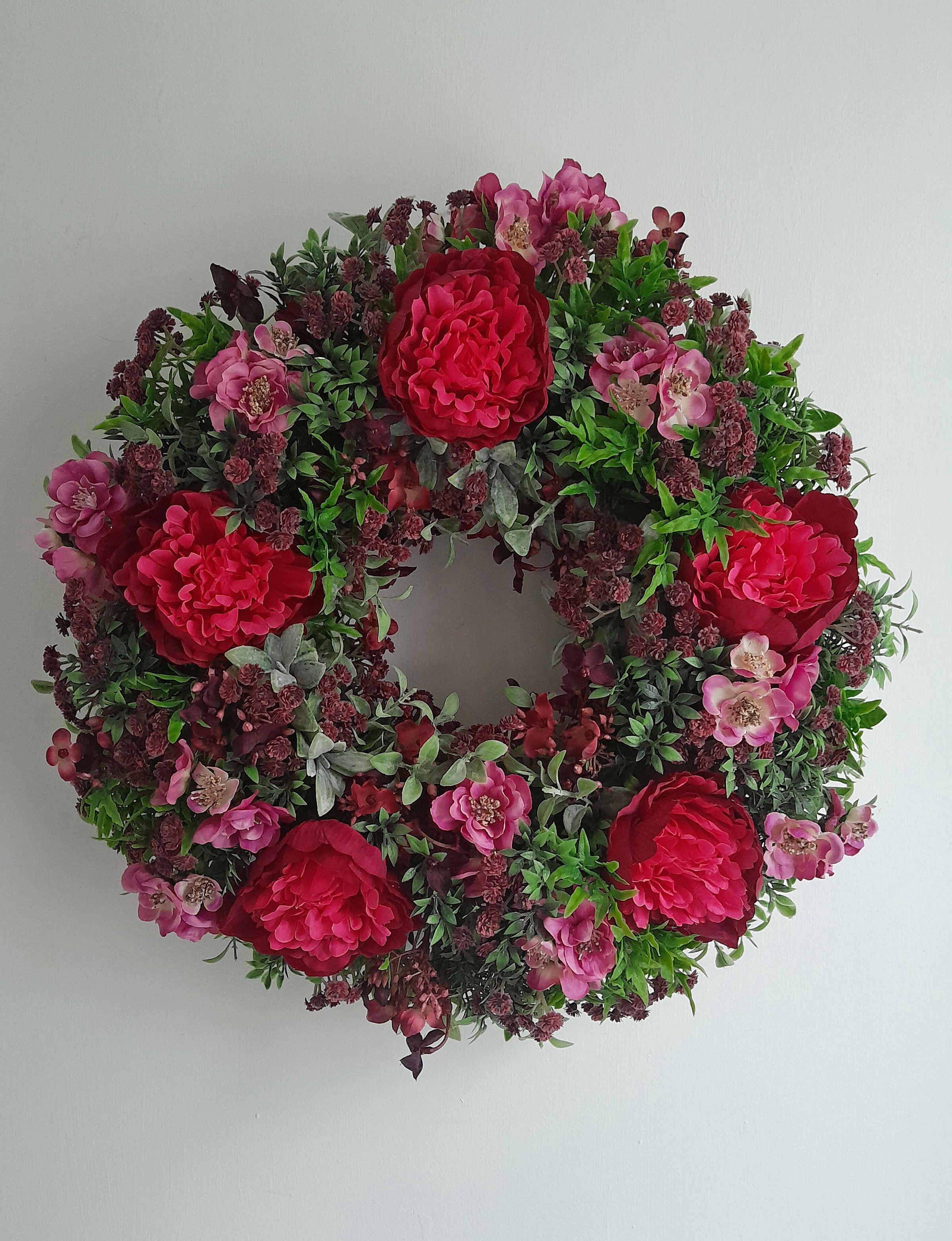 A full floral statement wreath filled with large red peonies and burgundy, plum, and magenta foliage. This wreath would give any front door a warm welcome.