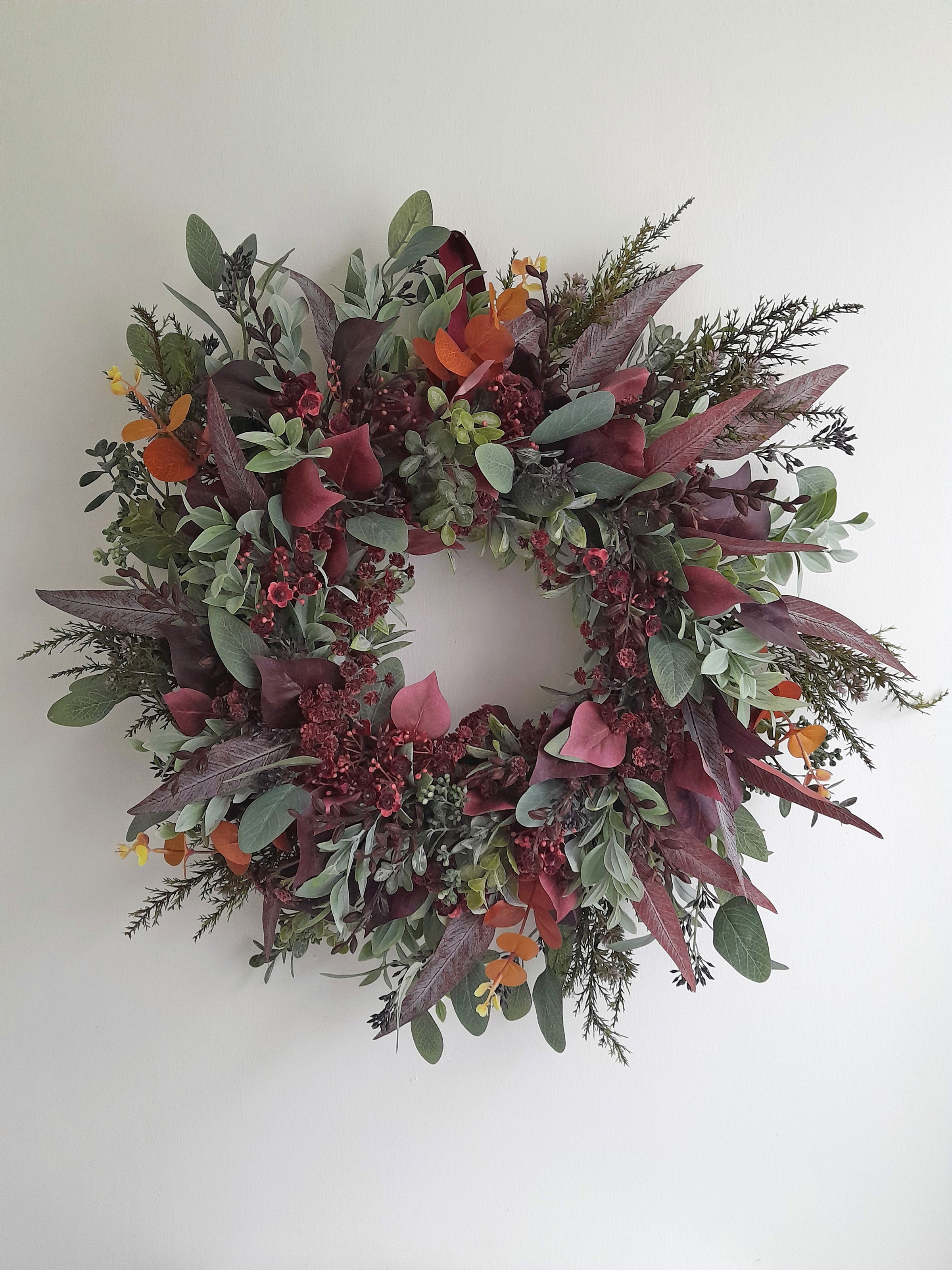A wreath designed with mixed autumn leaves highlighted with burgundy berries and gypsophila this wreath looks as stunning on a front door as above a mantle.