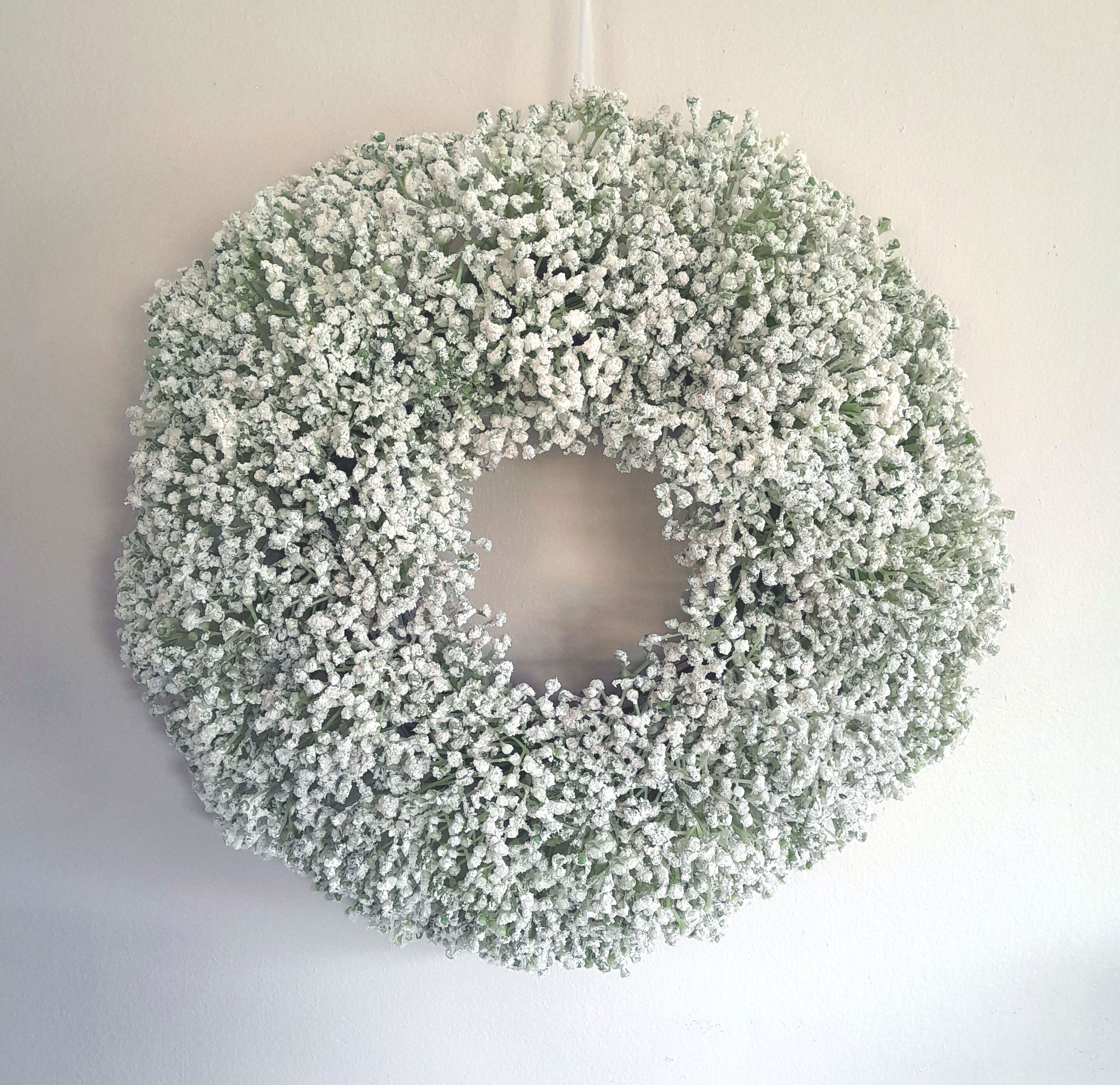 A large, full, white artificial flower gypsophila wreath. Measuring 60cm across and 20cm flower width, this showstopper would give any front door a warm welcome.
