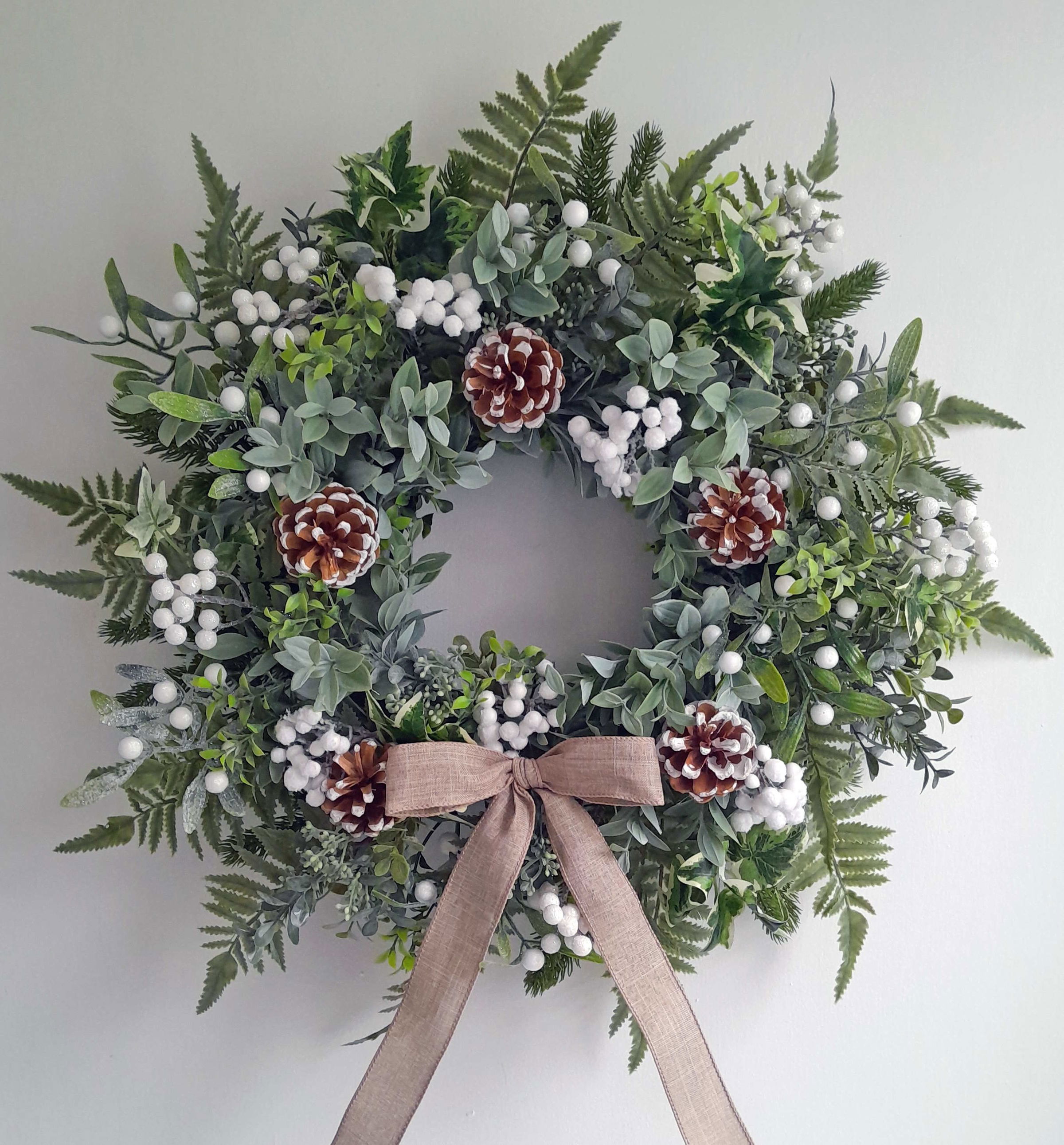 Adorned with pine, ruscus, boxwood, ferns, ivy, mistletoe berries, white berries, snowy pinecones and a burlap bow. This one will give any front door a festive welcome!