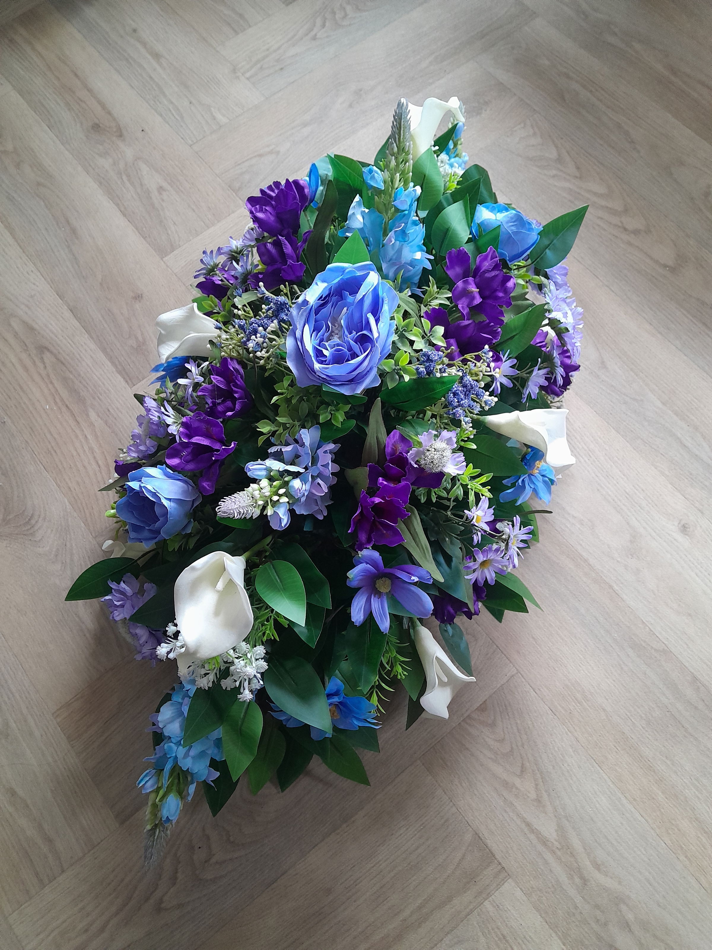 We can create bespoke floral pots for loved ones graves. These can be created in any colour/ style. Example above is filled with blue and ivory silk flowers.