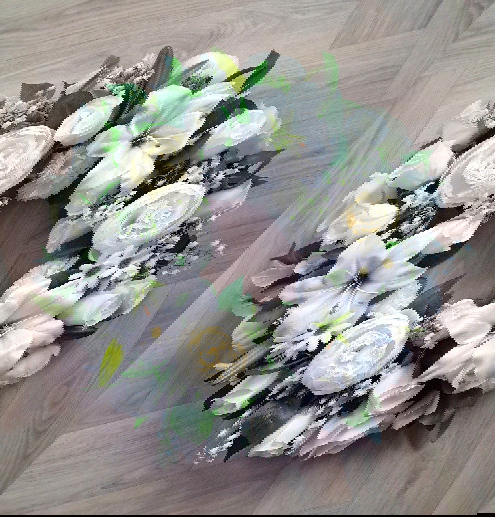 White peony, rose, and lily funeral and grave wreaths, available year round, available in two sizes 55cm (€65) and 45cm (€55) can be made in other colours to suit.