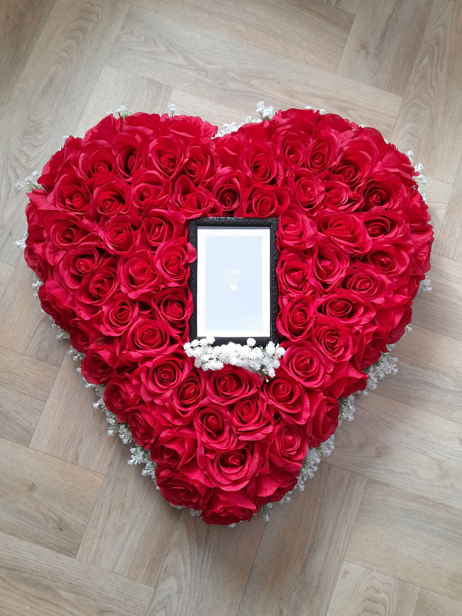 A grave wreath with a frame to include a photo of your loved one. Available in two sizes, 45cm (€95) and 60cm (€150). Can be made in other colours to suit.