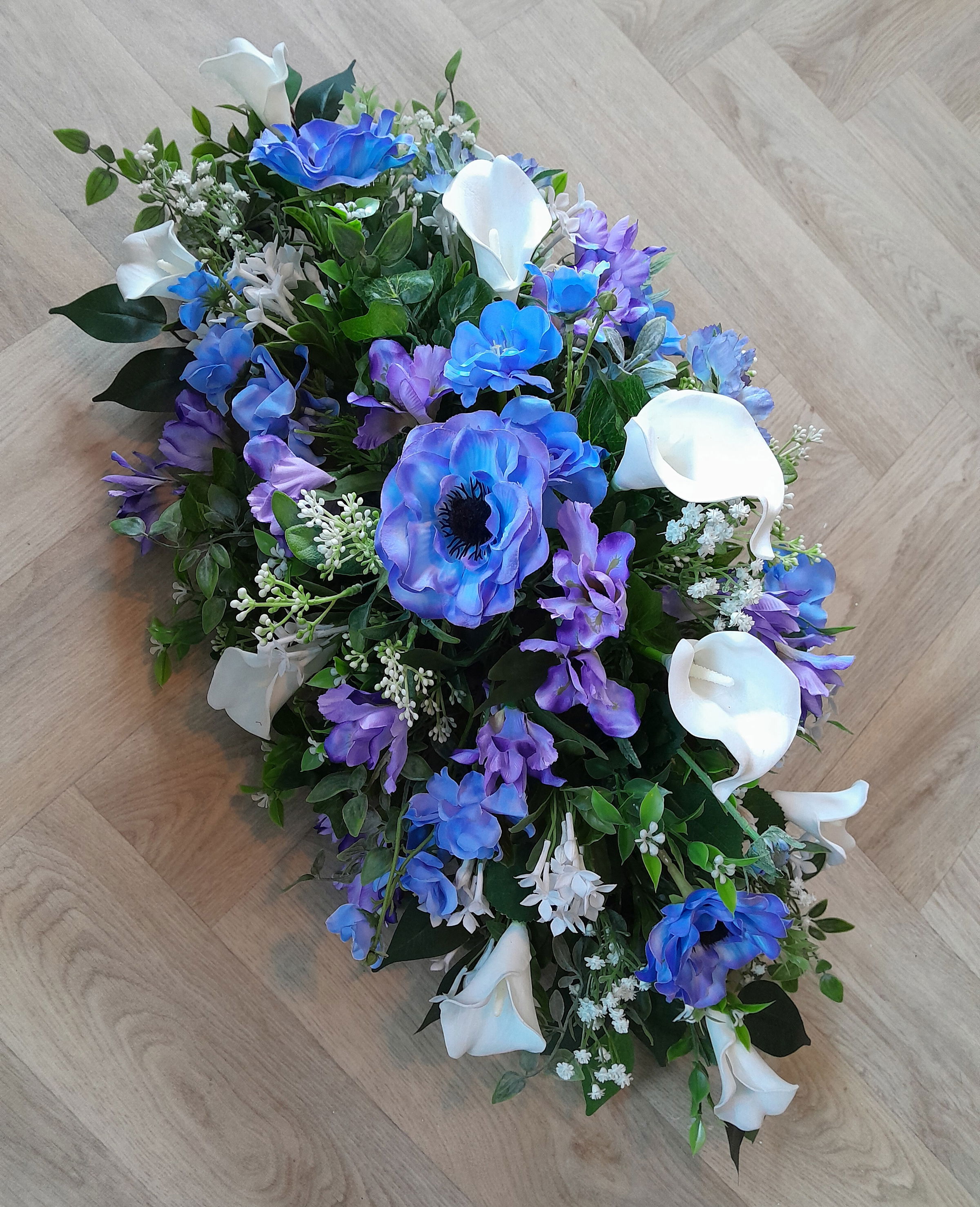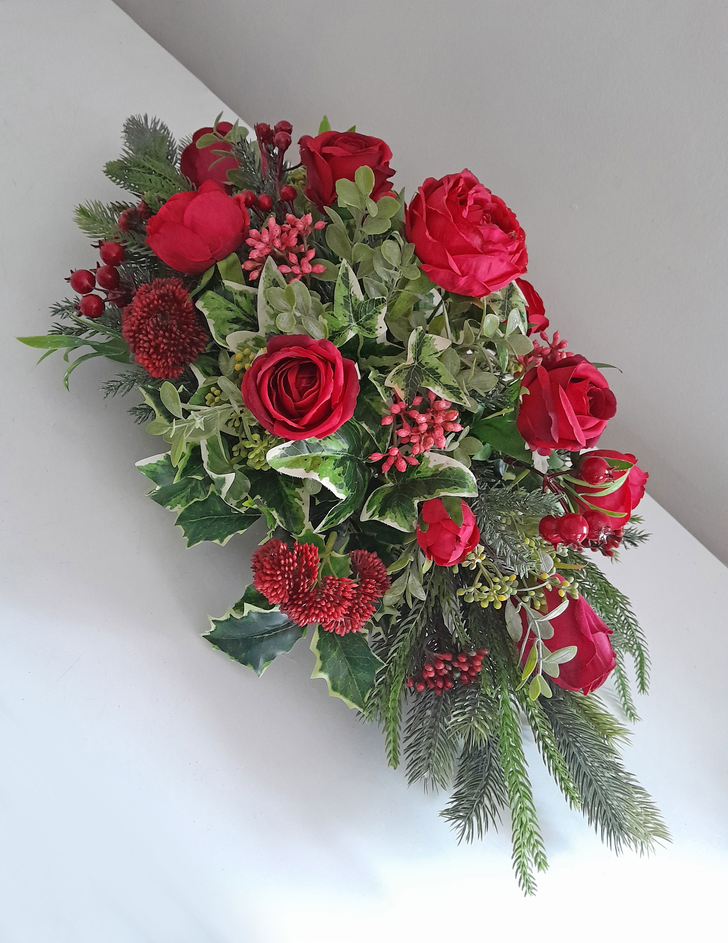 Funeral casket sprays are available in any colour, style or favourite flower of a loved one. A full casket spray measures approximately 5ft in length.