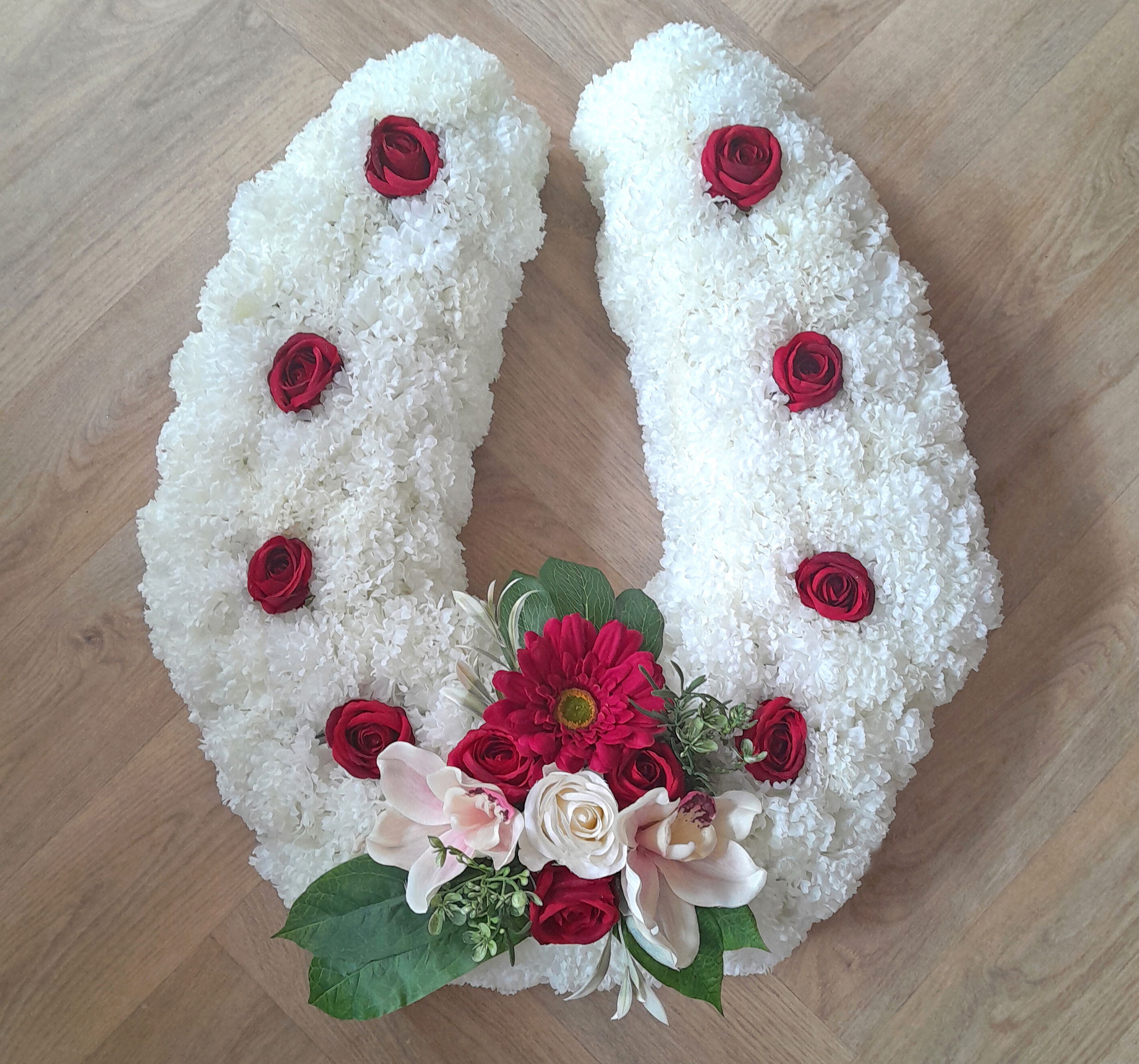 Horseshoe Grave Wreaths with carnations and roses available year round, available in two sizes 65cm (€85) and 45cm (€65), can be made in other colours to suit.