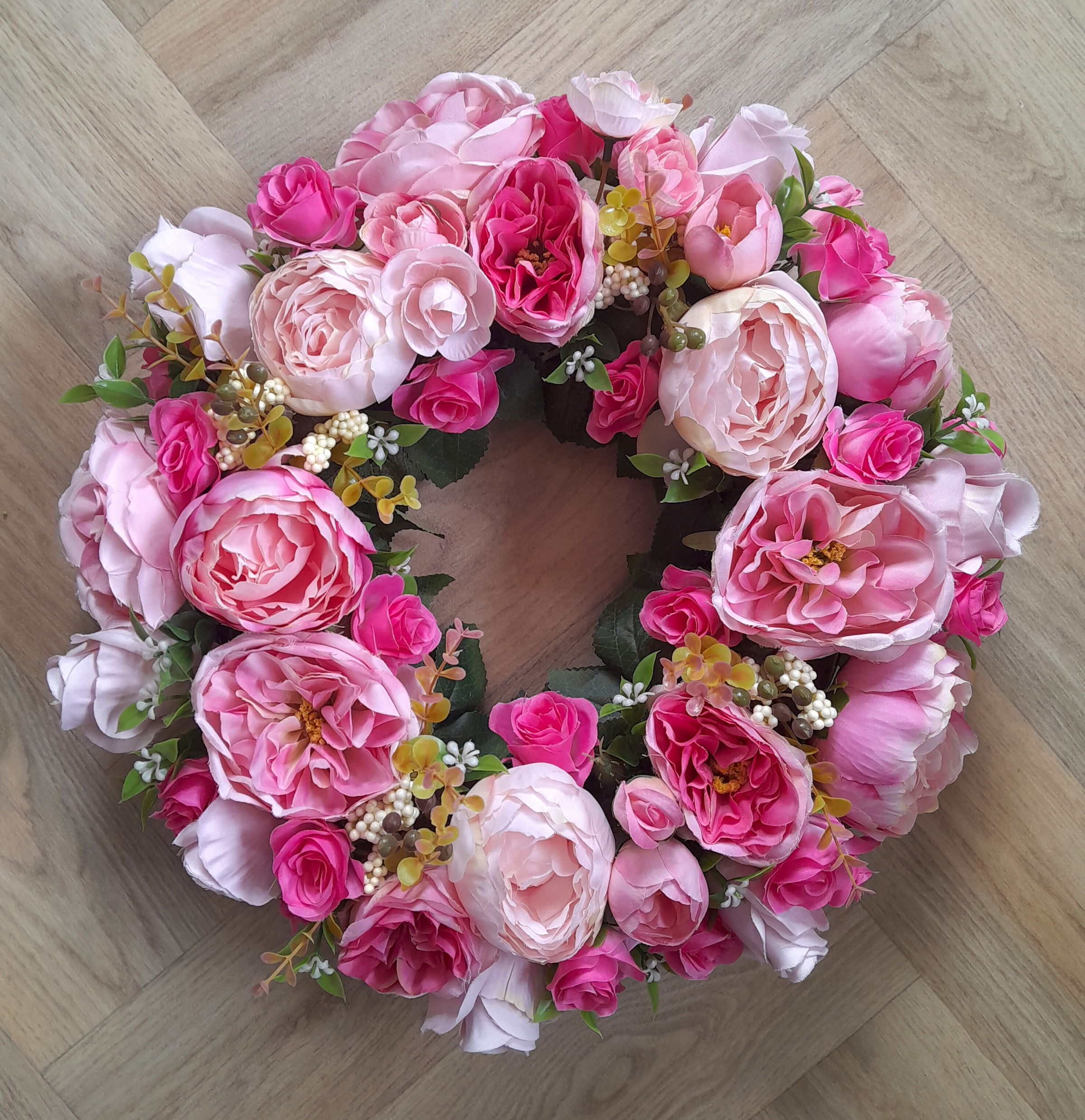 Pink peony, rose, and hydrangea funeral and grave wreaths, available year-round, available in two sizes 55cm (€65) and 45cm (€55) can be made in other colours to suit.