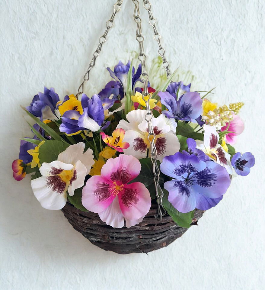 Measuring at 35cm wide these mixed pansy, iris, and narcissus, artificial hanging baskets, are a no maintenance, and no watering, stress free alternative.