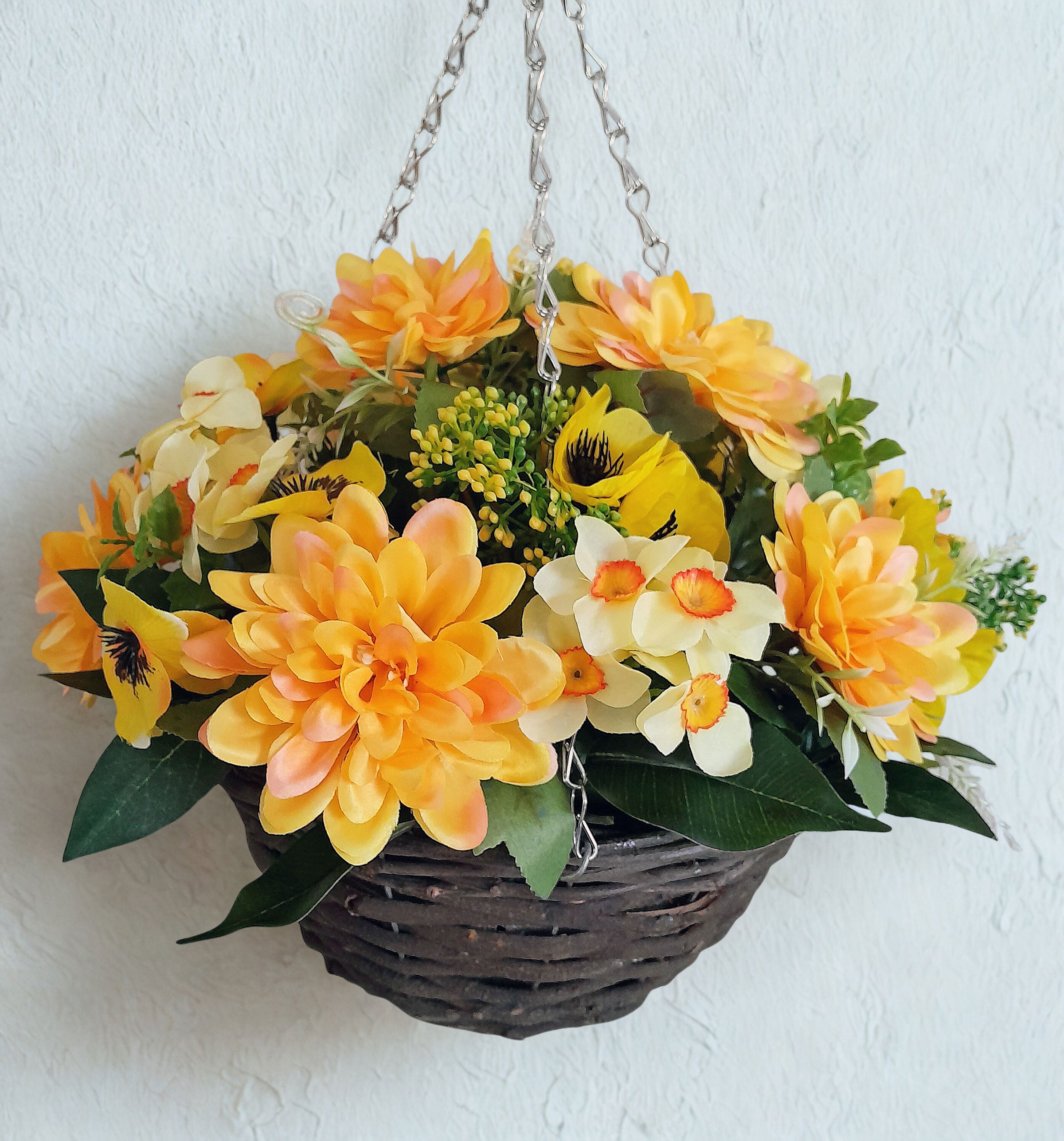 Measuring at 35cm wide these yellow and white artificial hanging baskets are filled with artificial gerbera, pansy, narcissus and daisy.